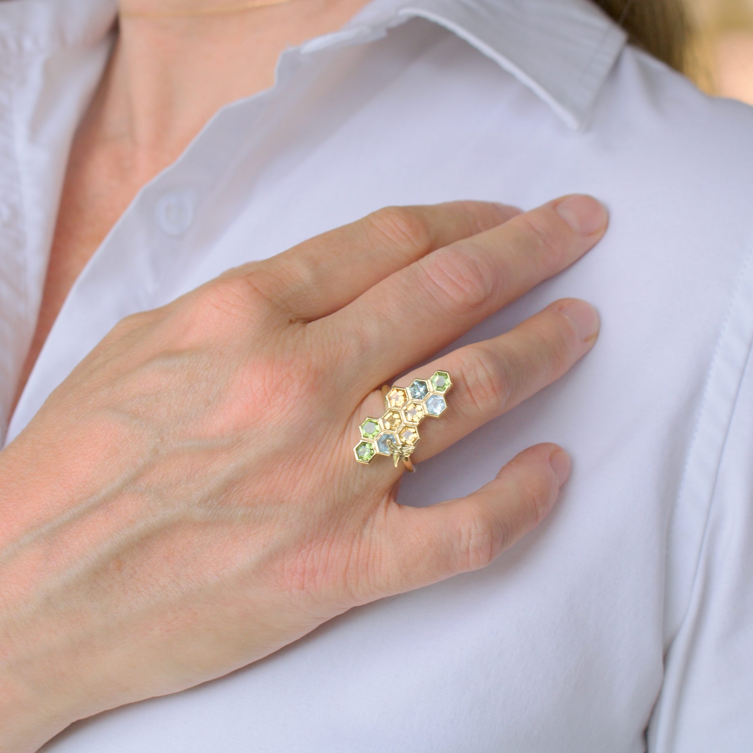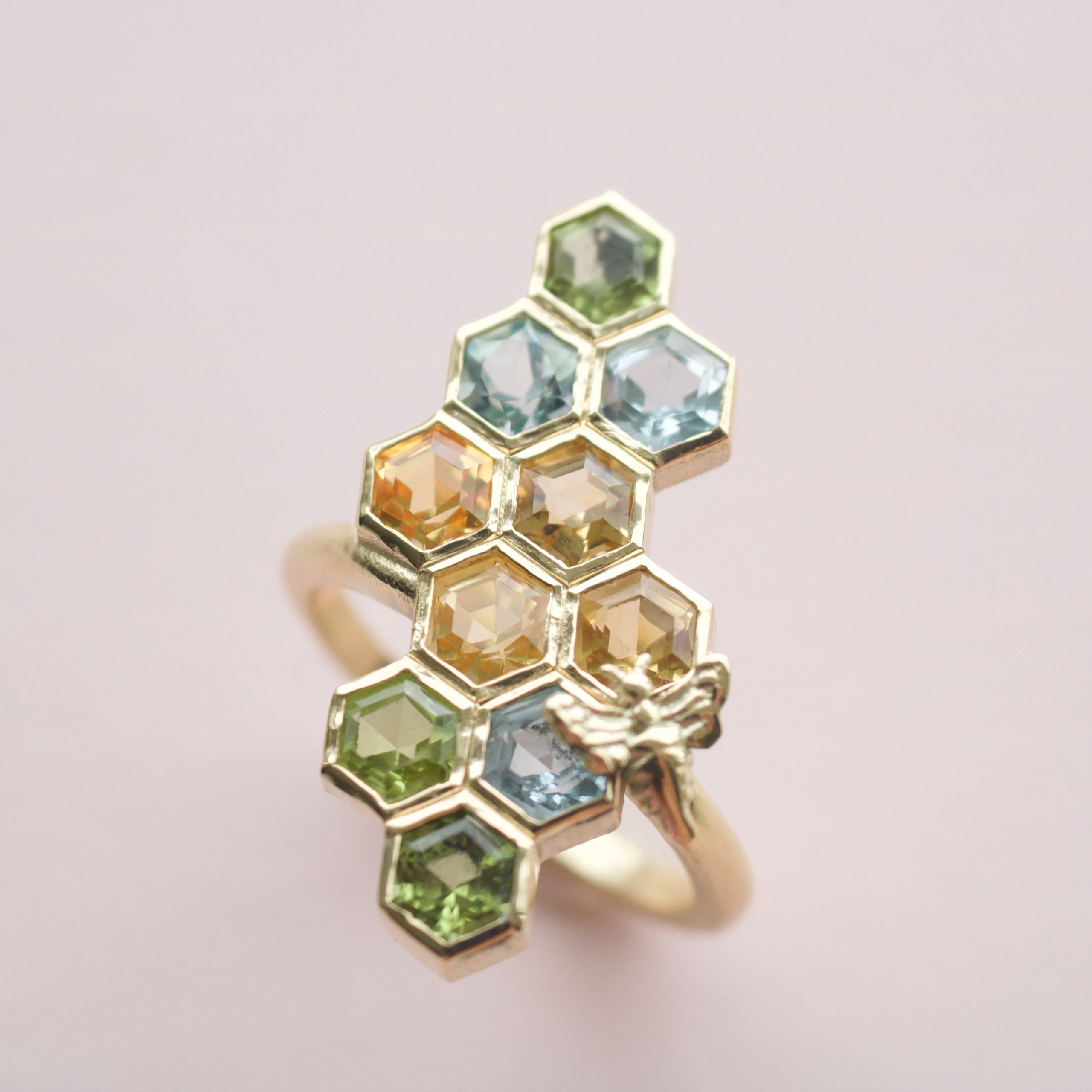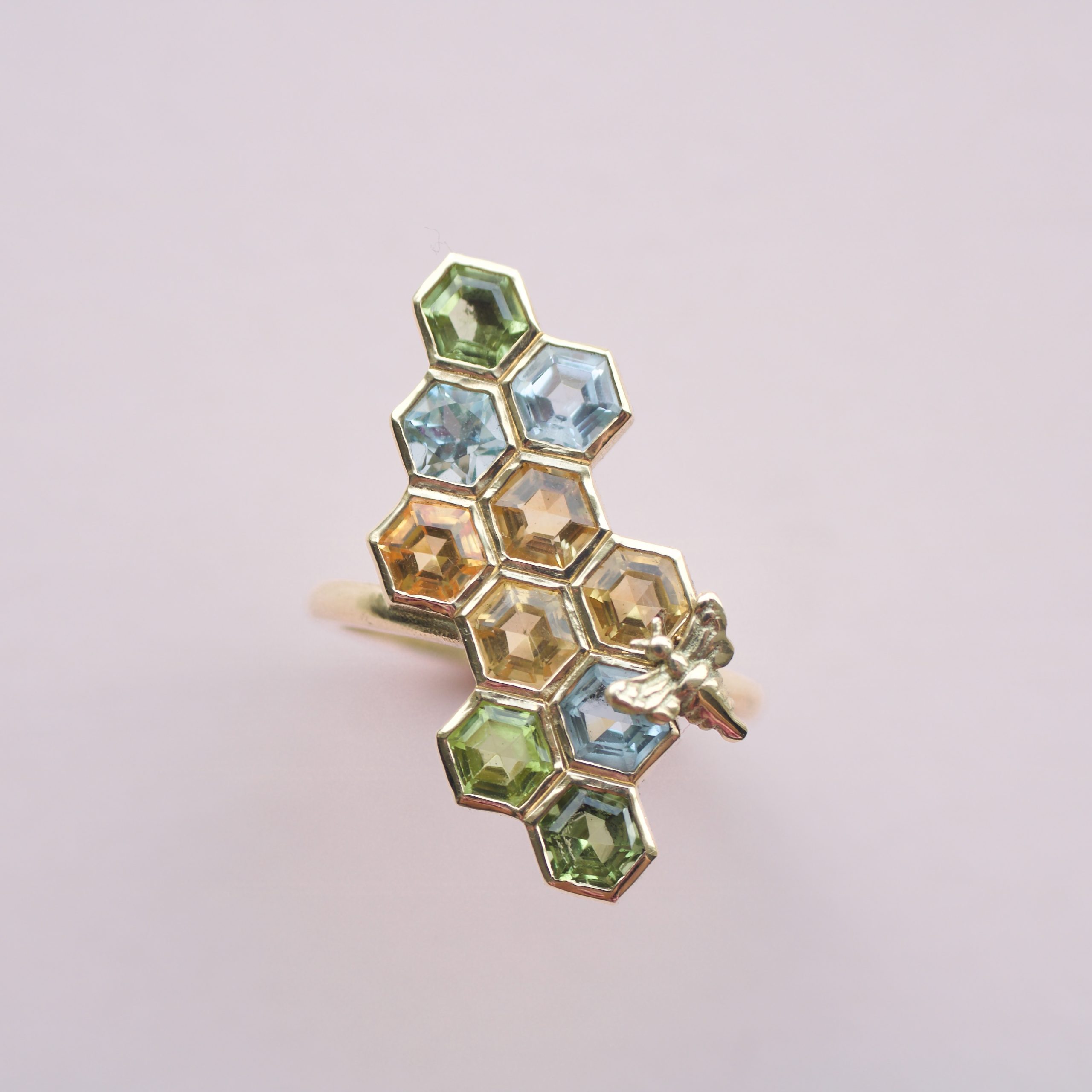 Made with aquamarine, citrine and peridot hexagonal gemstones and set in 14ct gold.
